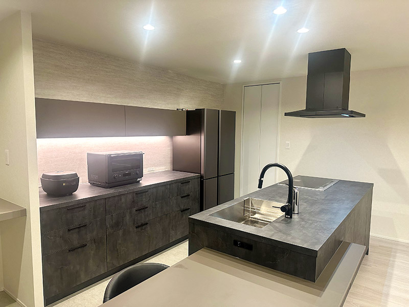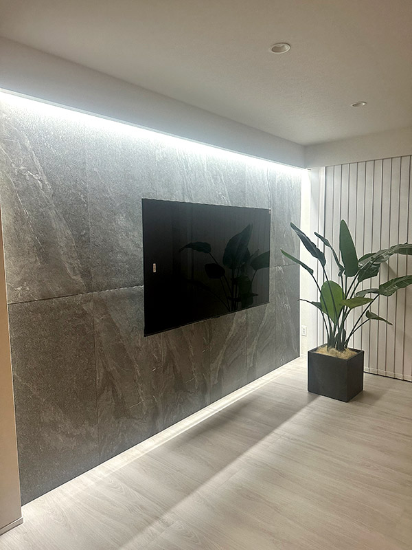 石目調タイルと間接照明が印象的なテレビ壁面、統一感あるモノトーンキッチン、上質感漂う床材で、洗練された開放的なLDK空間へと生まれ変わりました。
